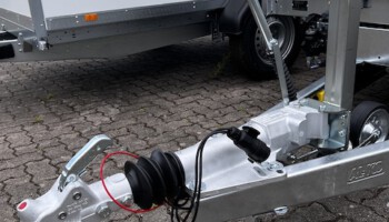 Dieser Anhänger hier hat eine Elektrohydraulik mit bordeigener Batterie, geschützt unter einer Haube unter der Ladefläche und zusätzlich vorn eine Handpumpe montiert.
