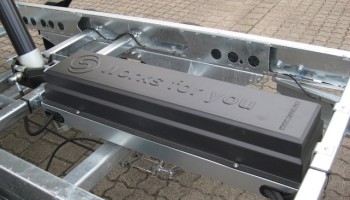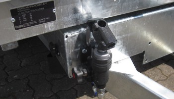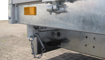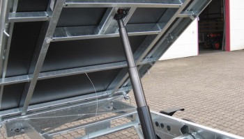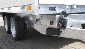 Dieser Anhänger hier hat eine Elektrohydraulik mit bordeigener Batterie, geschützt unter einer Haube unter der Ladefläche und zusätzlich vorn eine Handpumpe montiert.
