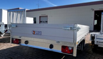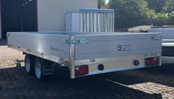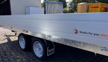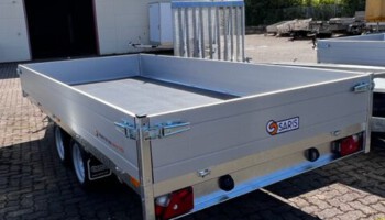 Der Saris Anhänger ist ein Pritschenhochlader mit Rädern unter der Ladefläche.